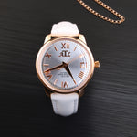 This elegant timepiece exudes timeless charm with its classic design and luxurious details. The silver dial, adorned with Roman numeral hour markers and delicate hands, creates a sophisticated aesthetic. The rose gold-tone case and white leather strap add a touch of luxury, making it the perfect accessory for any occasion.