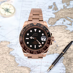 Embark on your global adventures with the Globetrotter's Timepiece. This sophisticated watch, crafted with a rose gold stainless steel case and bracelet, exudes timeless elegance. The black dial with luminous hands and markers ensures optimal readability in any lighting condition. The 24-hour GMT bezel allows you to track two time zones simultaneously, making it the perfect companion for frequent travelers.