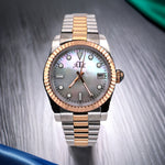 Indulge in timeless elegance with the Pearlescent Elegance watch. This exquisite timepiece features a stunning mother-of-pearl dial that shimmers with iridescent beauty. The two-tone stainless steel and rose gold bracelet adds a touch of sophistication, while the classic design ensures enduring style.